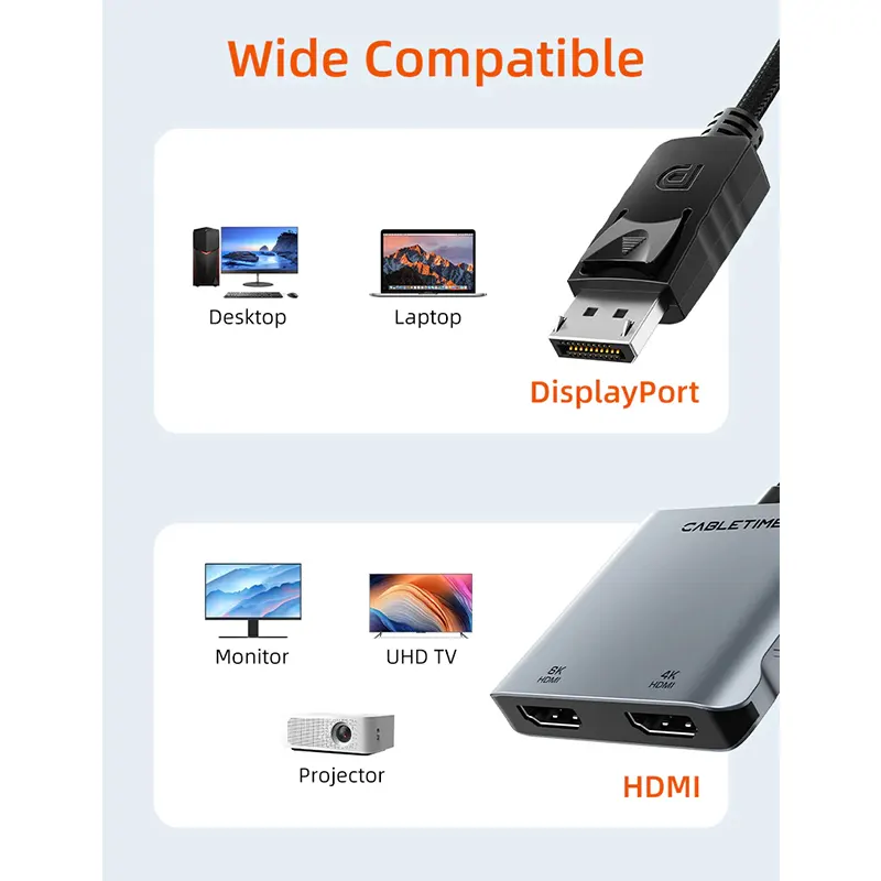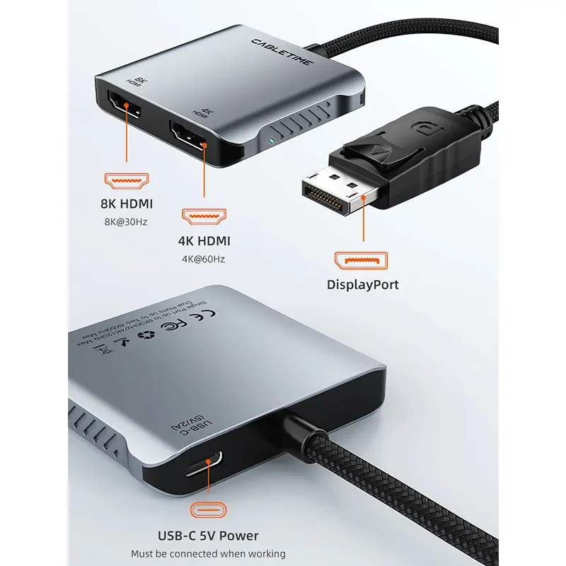 Adaptador de DisplayPort a HDMI 4K/8K, USB-A, USB-C 5V Power - CABLETIME | CB74G
