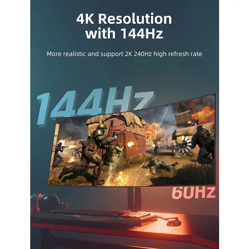 Admite 8K a 60 Hz, 4K a 144 Hz, 2K a 240 Hz.