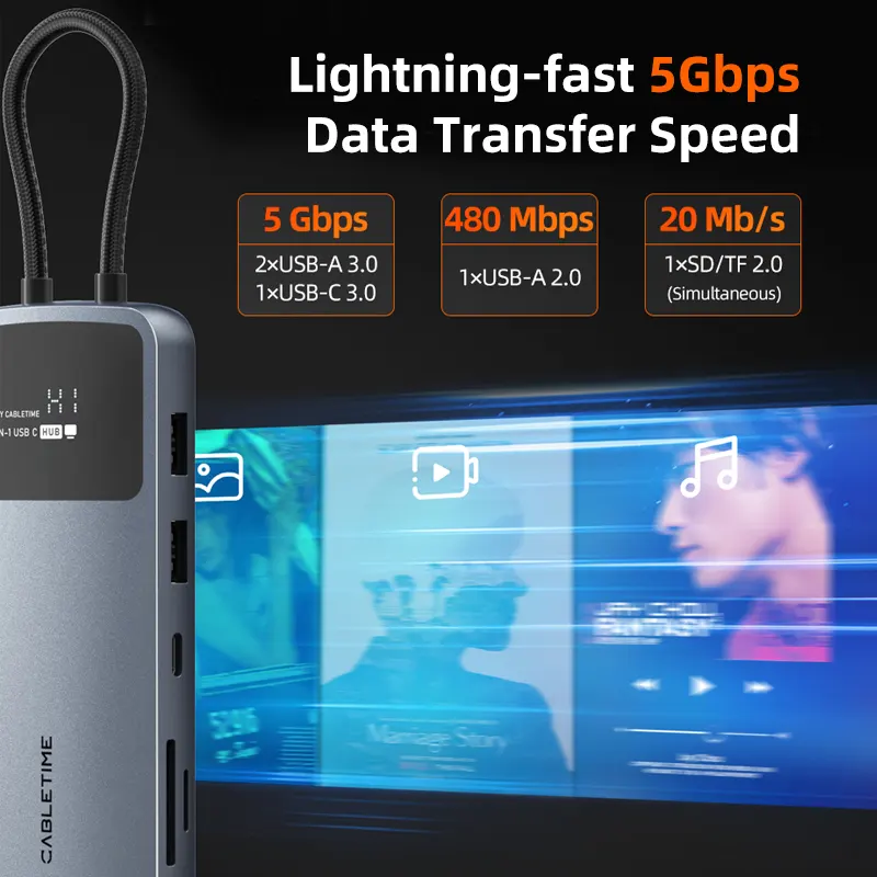 Adaptador Hub de USB-C a HDMI, USB-A, SD, TF, PD, RJ-45 - CABLETIME | CB92G