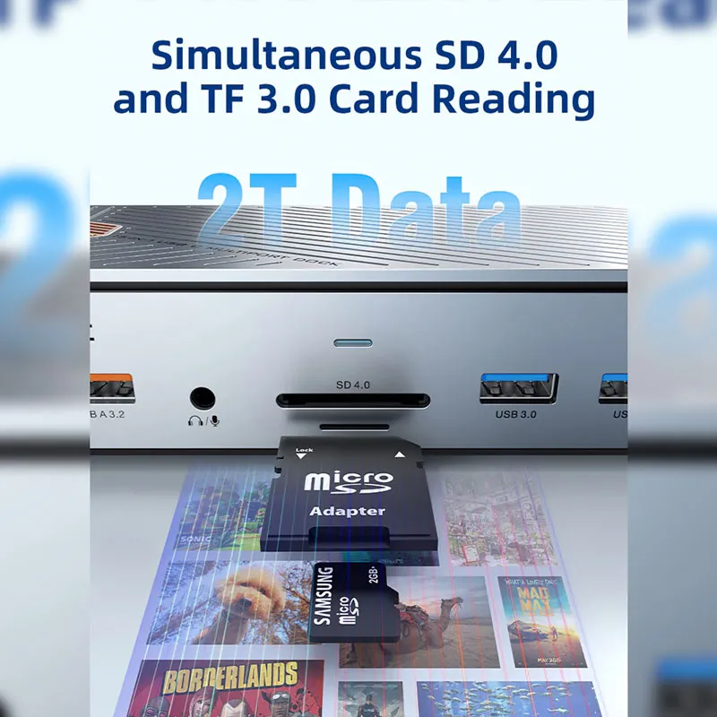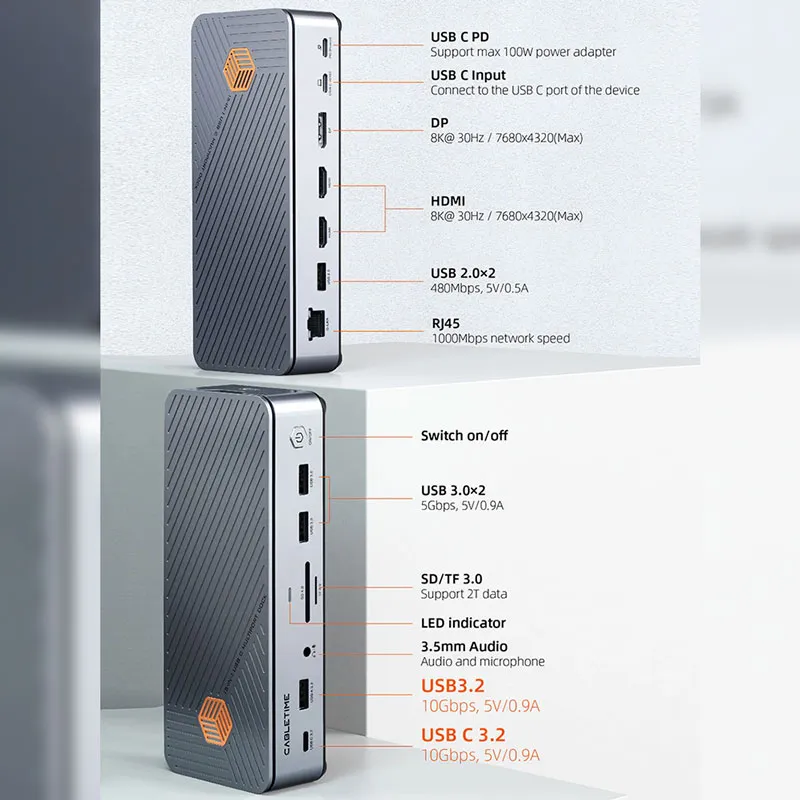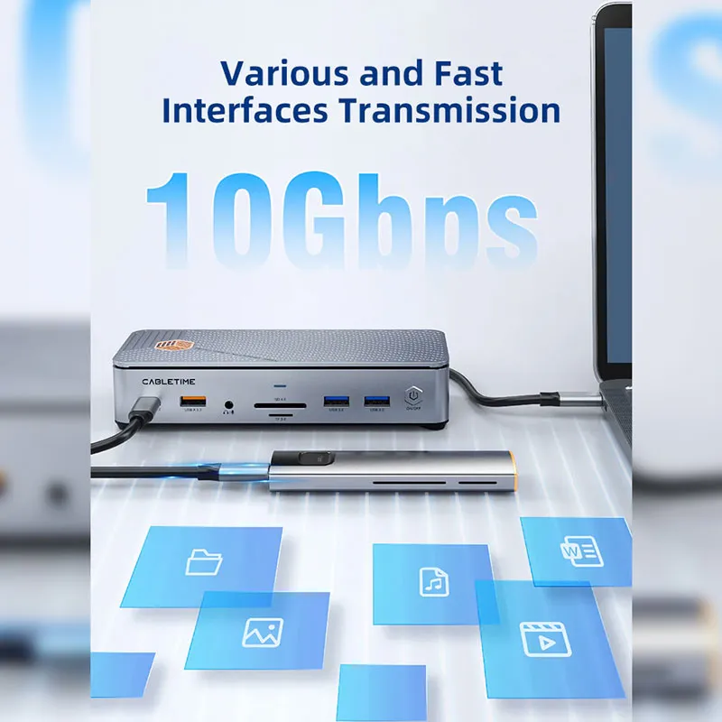 Docking station 14 puertos que incluyen HDMI, DisplayPort, USB-A, USB-C, SD/TF, RJ-45, Audio 3.5mm, PD100W y Slot SSD NVMe/NGFF - CABLETIME | CB14S